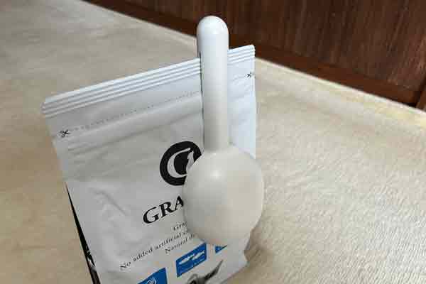 定期コースの2回目にオリジナルフードスクープ(計量スプーン)がプレゼントされます。フードの袋に掛けて置けるので、スッキリまとまります。