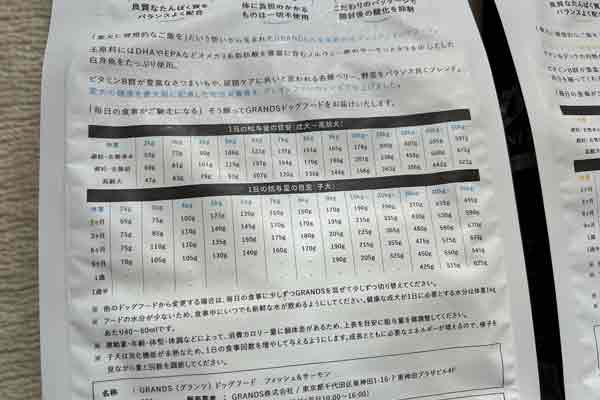 フードのパッケージ裏面には給餌量表が分かりやすく掲載されていますので安心です。