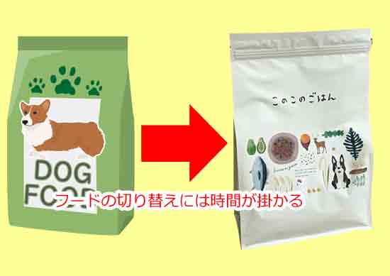 また、このこのごはんの切り替えには、愛犬が急にフードが変わってお腹がビックリして下痢や嘔吐になる場合もあります。そのため約1週間ほど掛けて少しずつ今までのフードに混ぜて切り替える必要があります。