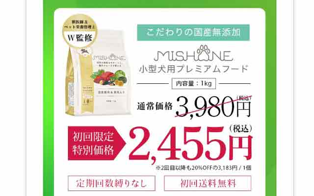 定期コースと聞くとハードルが高く感じるかもしれませんが、ミシュワンは初回限定で2,455円(税込)・送料無料で始められます。さらに、1回だけで解約できるので、愛犬の口に合わなかった場合も安心です。