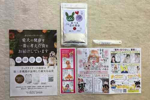 食べる目の革命は、このようにサプリ本体・計量スプーン・発売元ドッグダイナーのカタログ・漫画の使い方解説・漫画の与える量の注意事項となっています。
