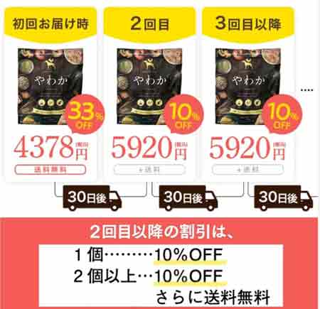やわかドッグフードを定期コースで買う場合は、このページの緑色のボタンから移動して購入すると定期初回限定で通常価格6,578円が33%OFFの4,378円になり最安値となります。